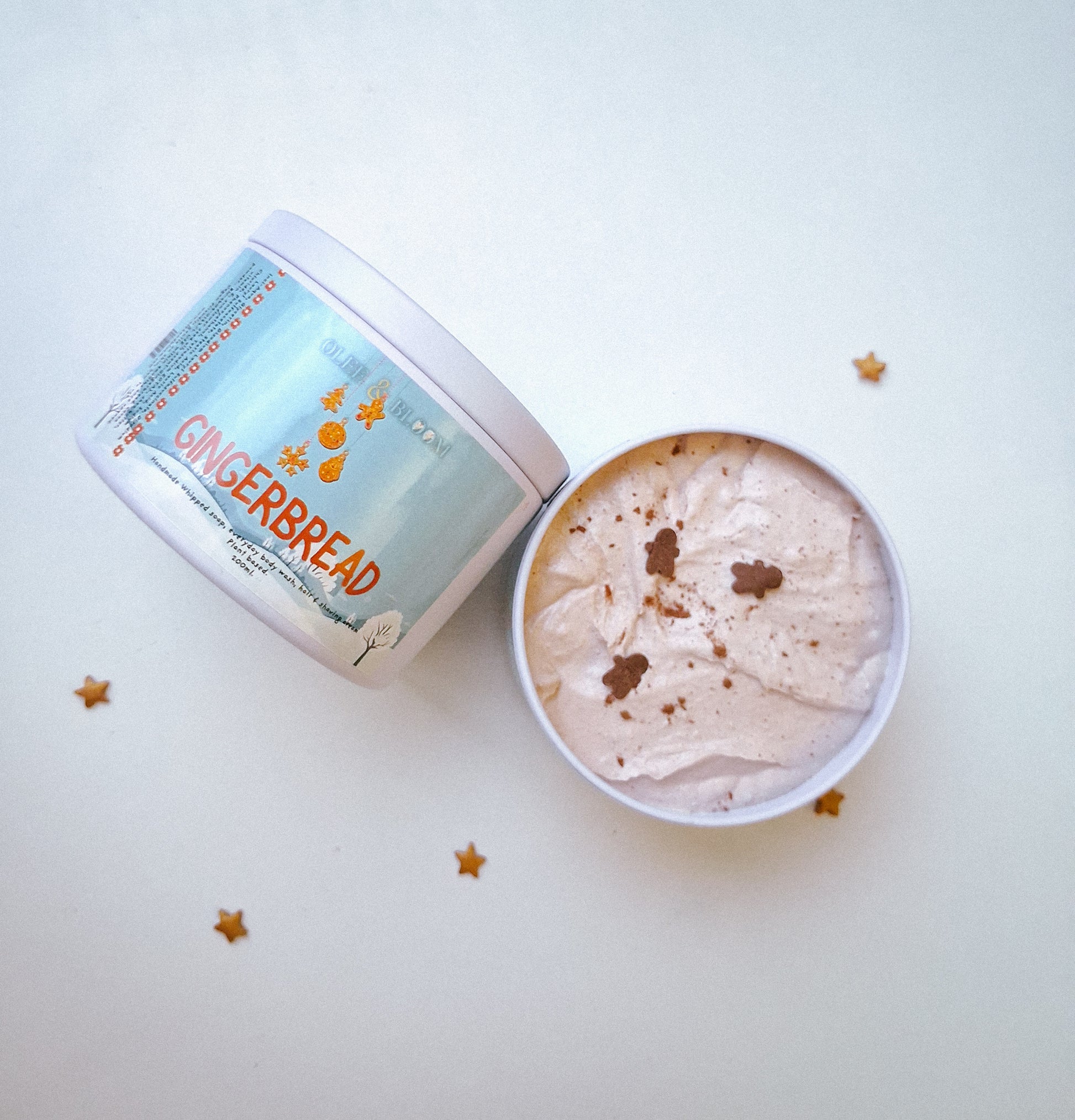 Gingerbread Whipped Soap (200ml) ā a creamy, bubbly treat that gently cleanses the skin while filling your shower with the comforting aroma of freshly baked gingerbread.
