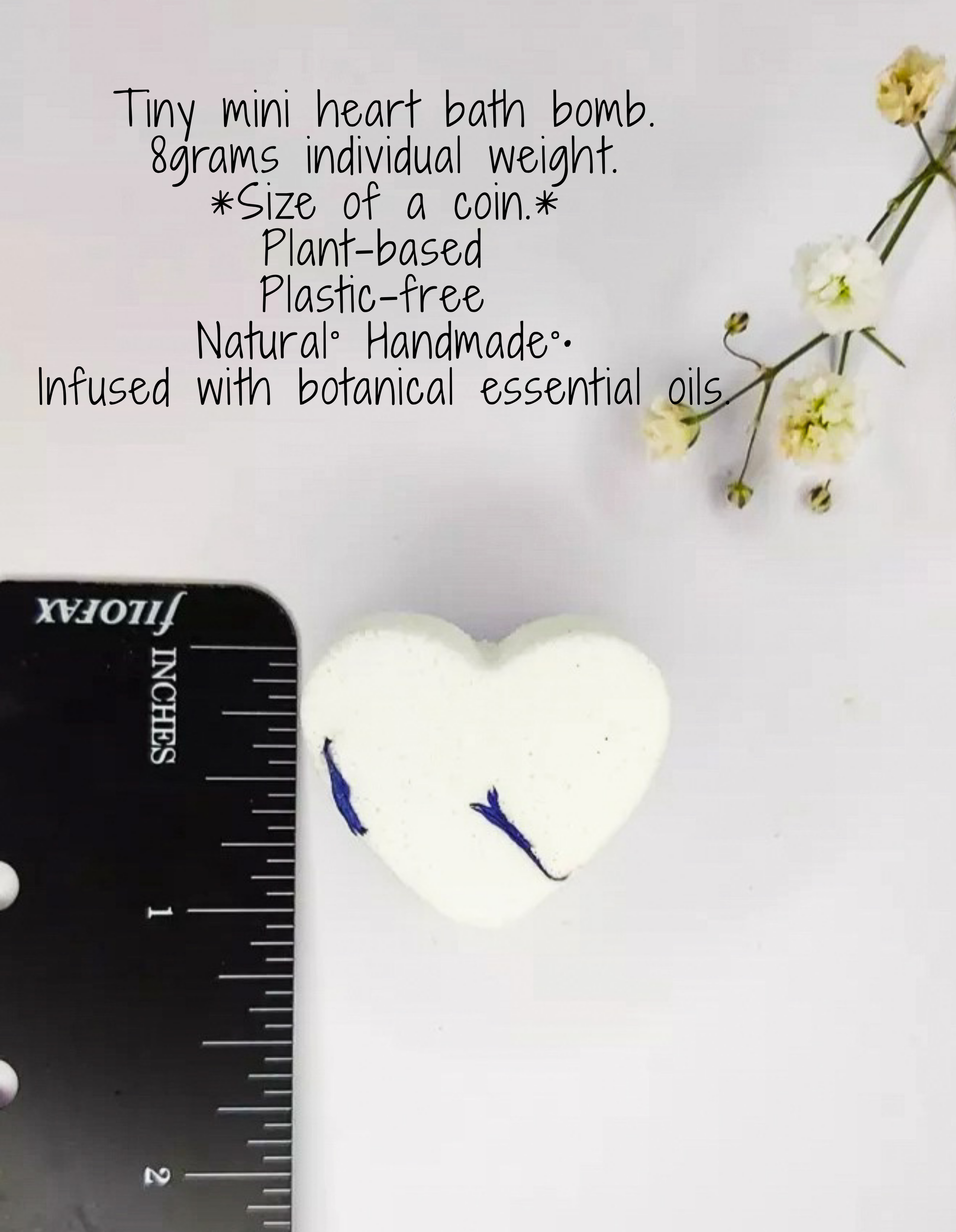 Each pack contains eight (10) mini bath bombs, naturally adorned with botanical petals or salt crystals for an elegant touch.