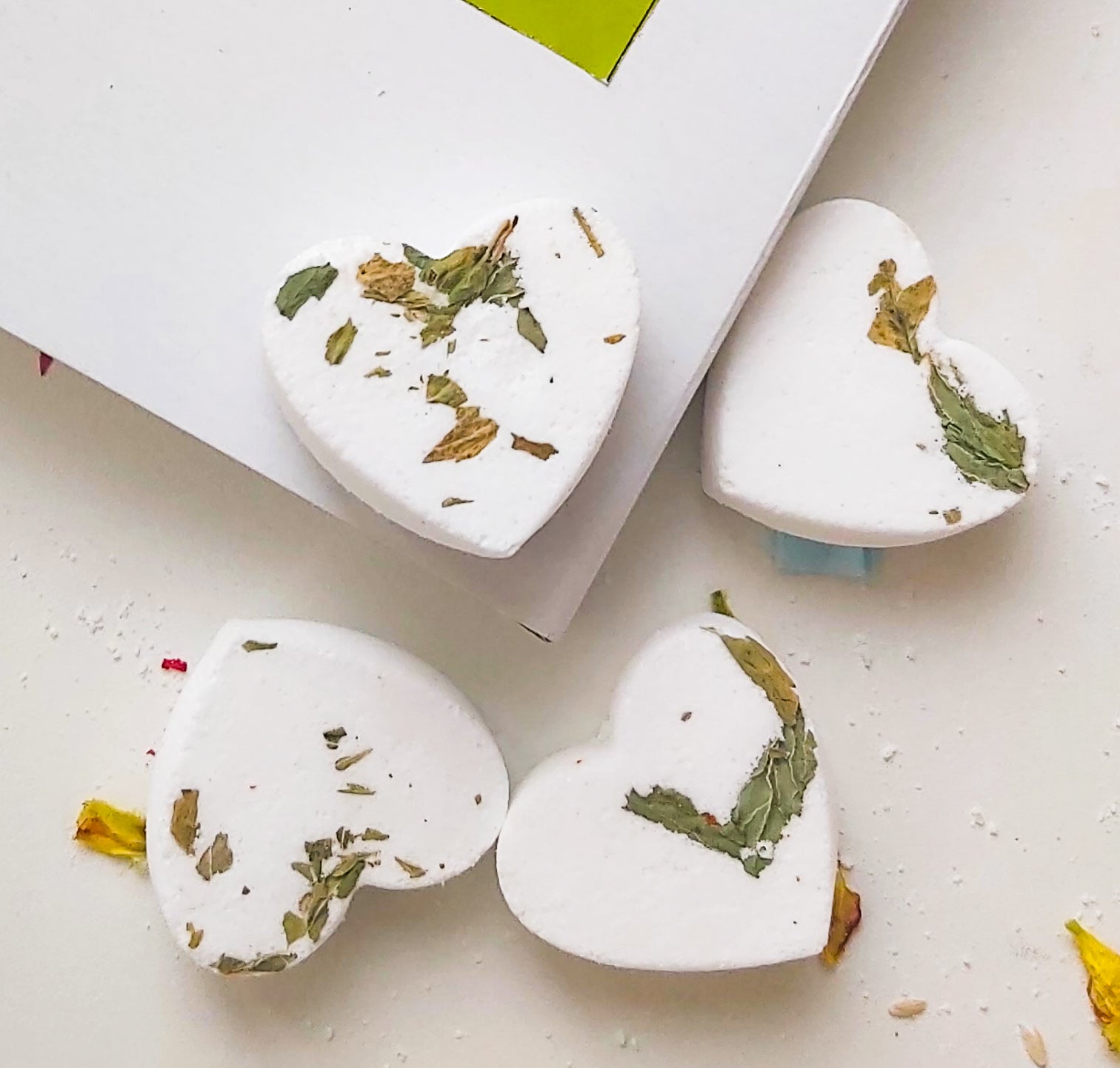 Each pack contains eight (10) mini bath bombs, naturally adorned with botanical petals or salt crystals for an elegant touch.